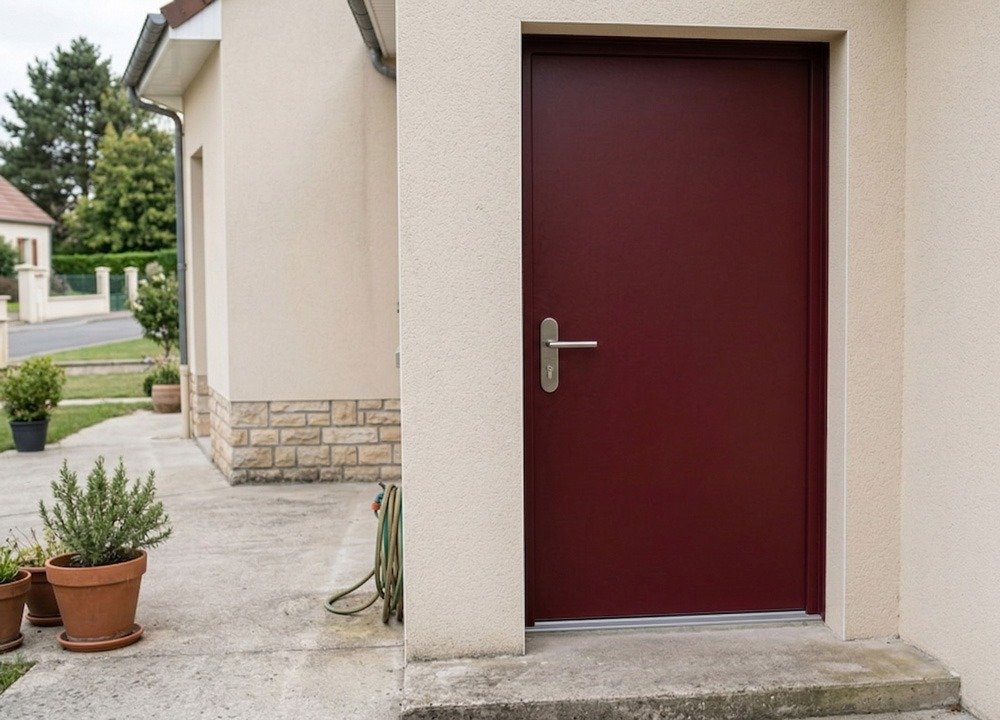 La principale problématique rencontrée concernait la nécessité de remplacer une ancienne porte en bois sans détériorer l’encadrement existant. Pour répondre à cette contrainte, la pose a été réalisée en applique intérieure, avec un habillage périmétrique sur mesure. Cette technique permet de masquer l’ancien dormant bois, assurant une finition soignée et harmonieuse, tout en respectant l’aspect extérieur de la maison. L’application du coloris Rouge Pourpre (RAL 3004), validée par le nuancier urbain local, confère à la porte un caractère audacieux et contemporain, tout en restant conforme aux exigences du PLU.