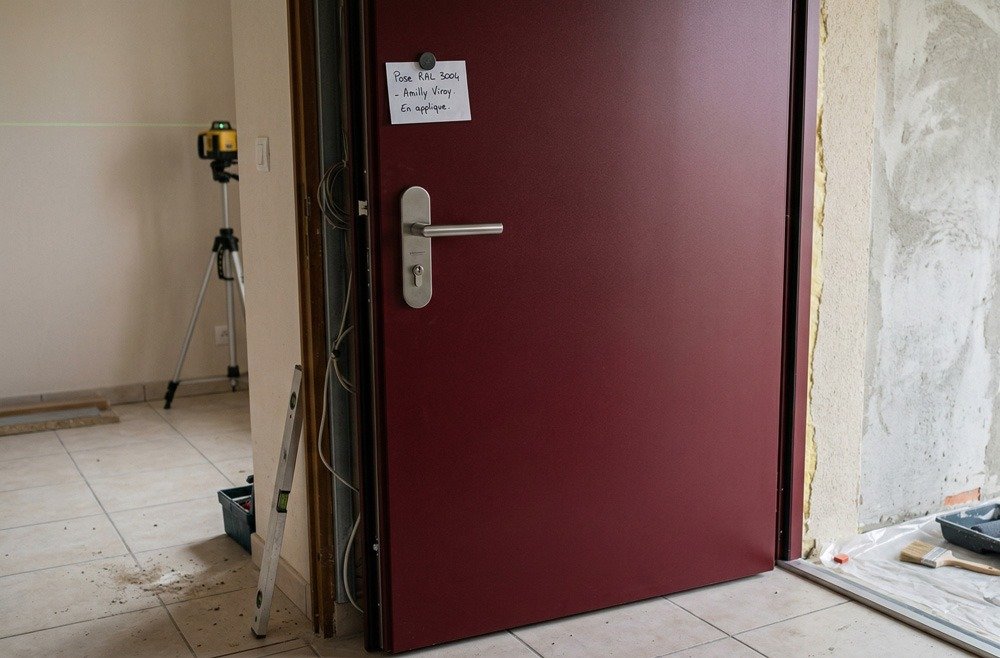 Porte d’entrée rouge RAL 3004 installée à Amilly